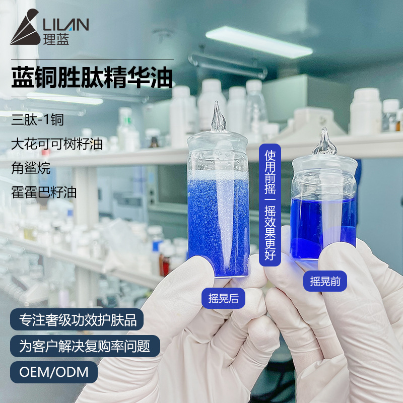 0.3%蓝铜胜肽粉末+0.2%超分子蓝铜肽,黄金水油配比,年销售量超60万瓶